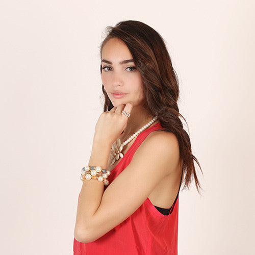 Stretchable bracelet with assorted pearls, marbled stone beads, and gold beads separating each accent. Perfect for layering with other matching bracelets! One size fits all..