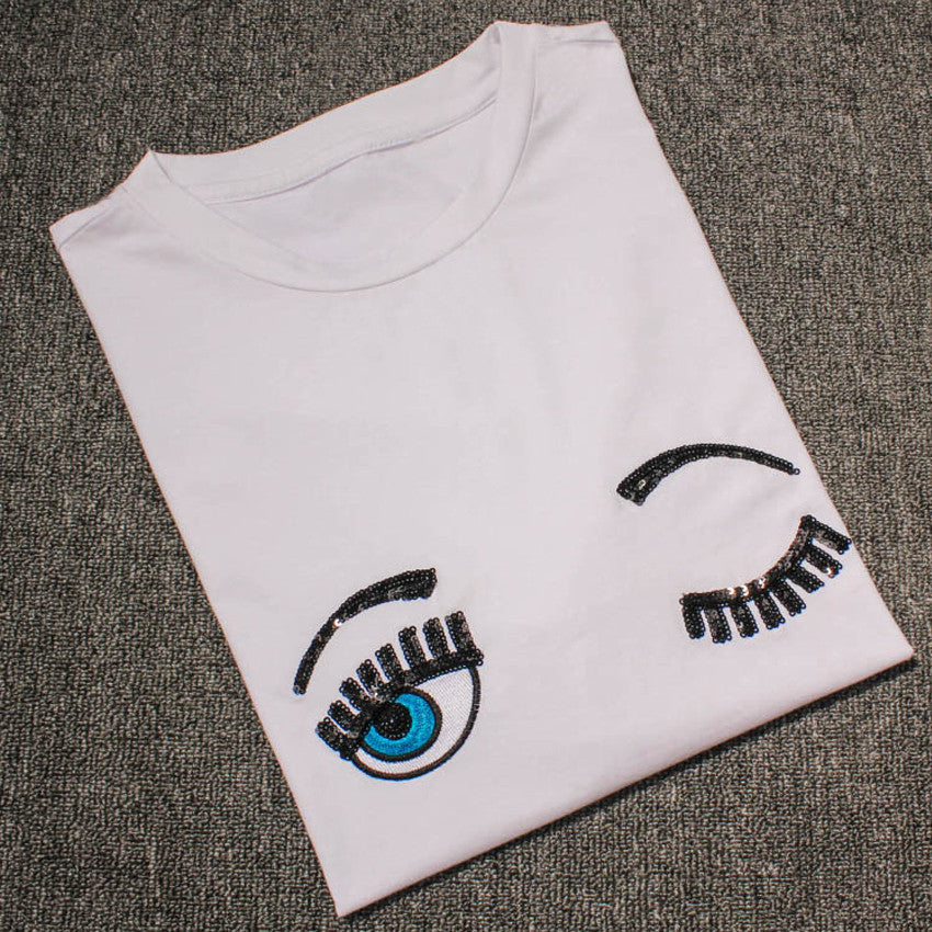2016 New Fashion Summer Cotton Women T Shirts Chiara Ferragni Big Eyes Embroidery Sequins Loose Style T Shirts Women Casual Tops.....