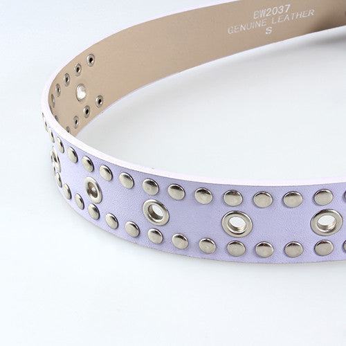 Complement your outfit with this purple faux leather belt featuring perforated metal accents and circle accents studded all over. Goes perfectly with fitted jeans! Available in all sizes.