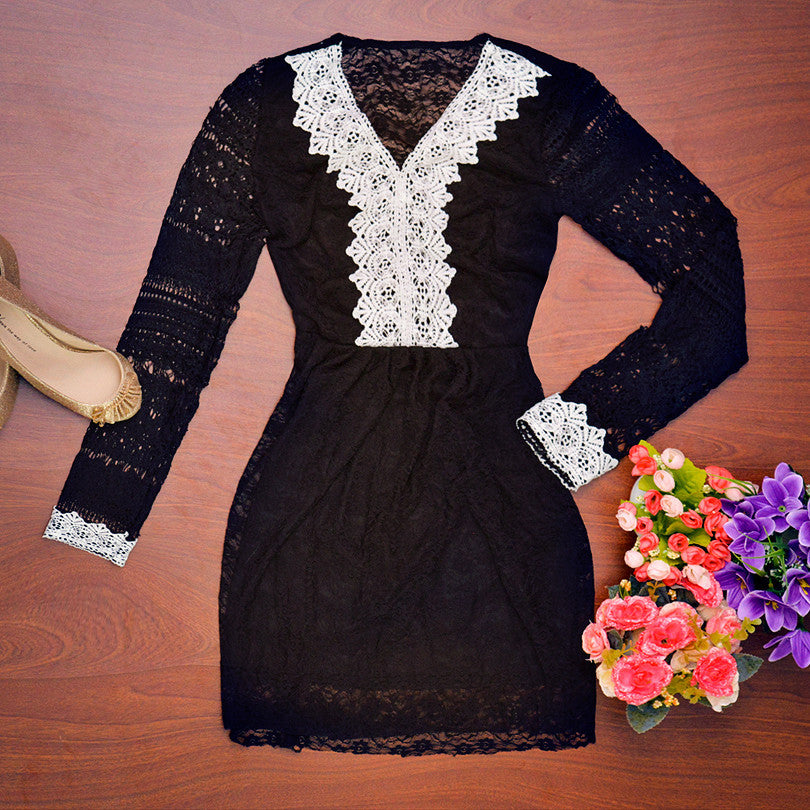 2016 nuove donne di modo di a-line vestito nero sexy scava fuori lace abiti casual manica lunga mini dess